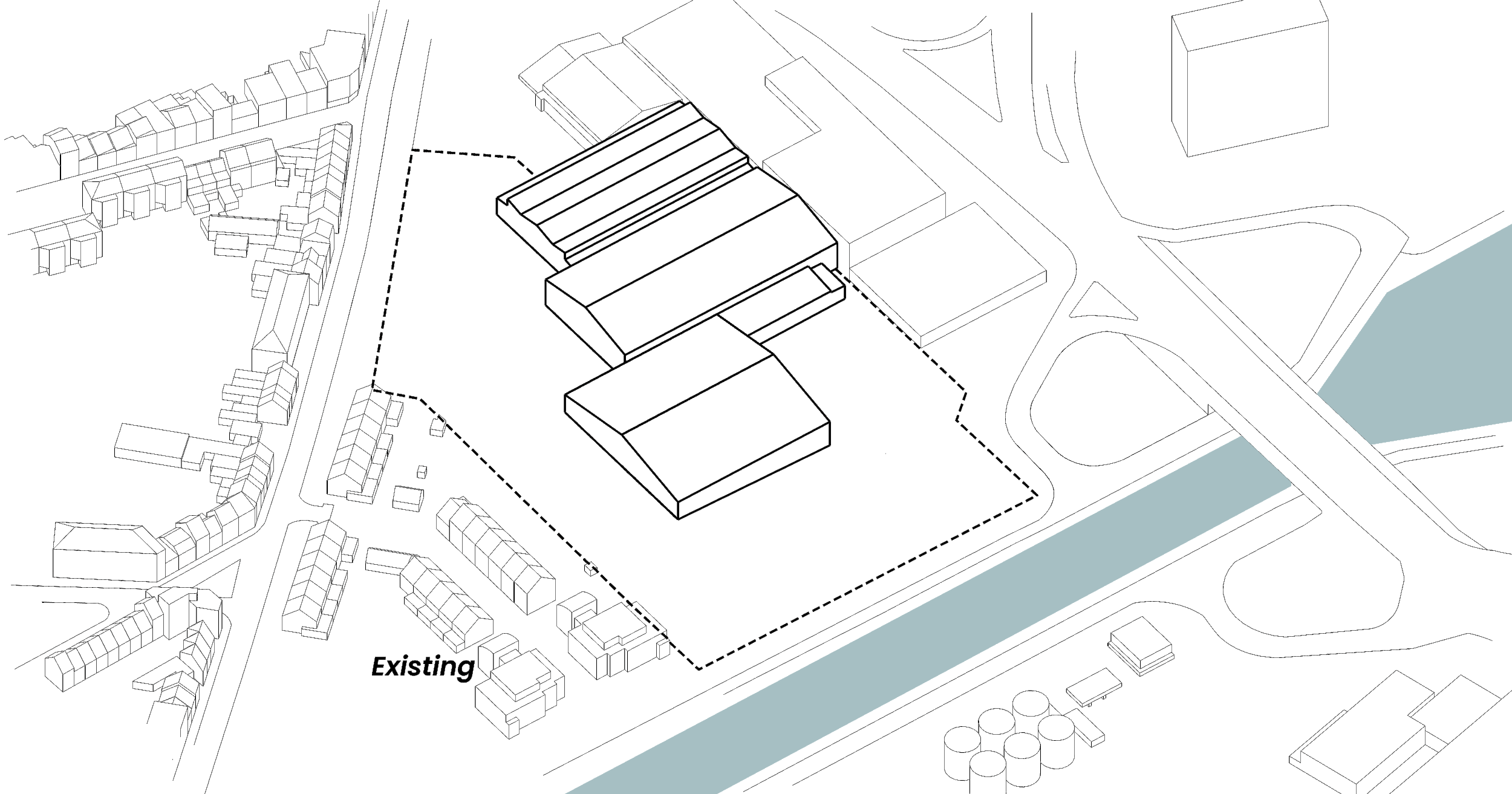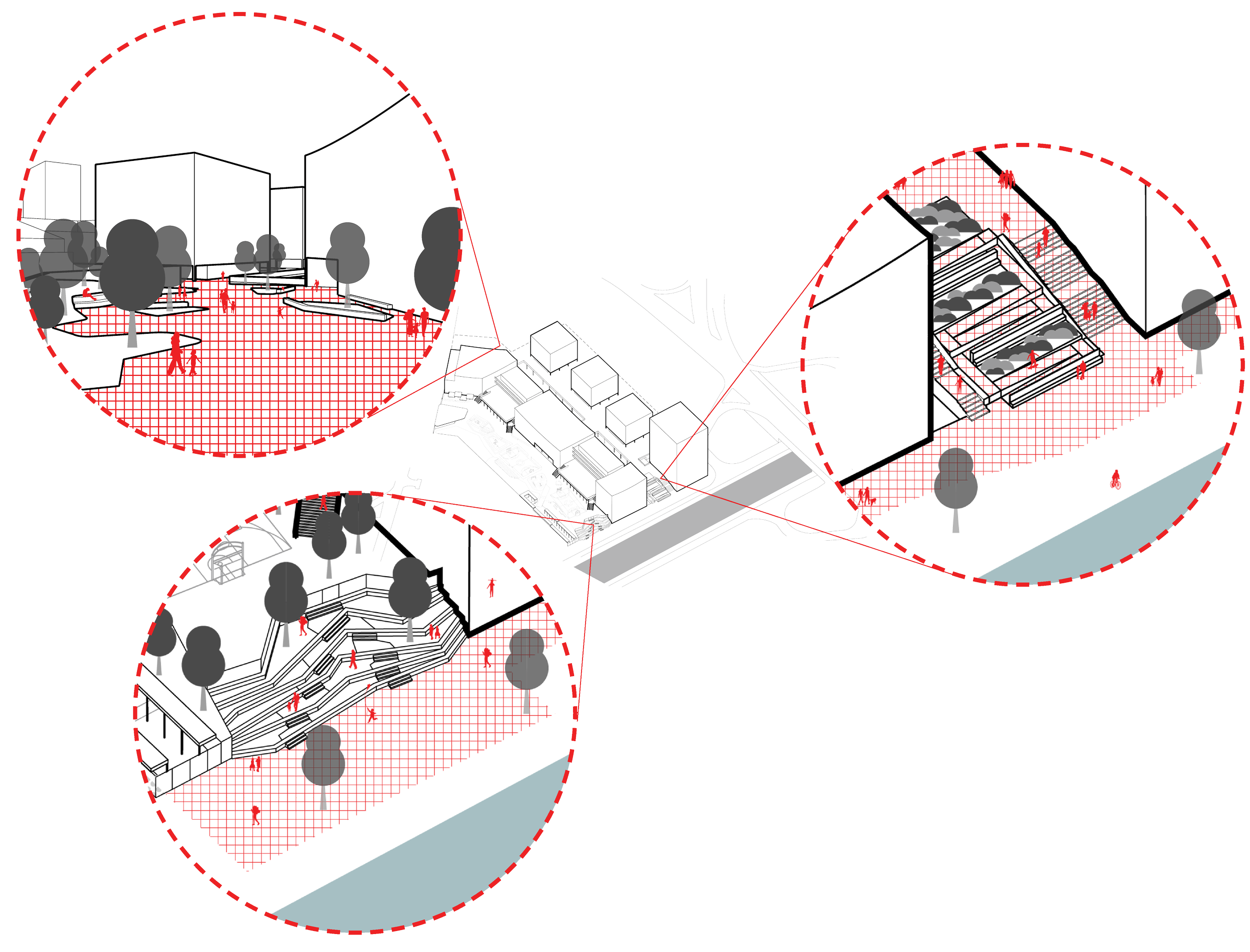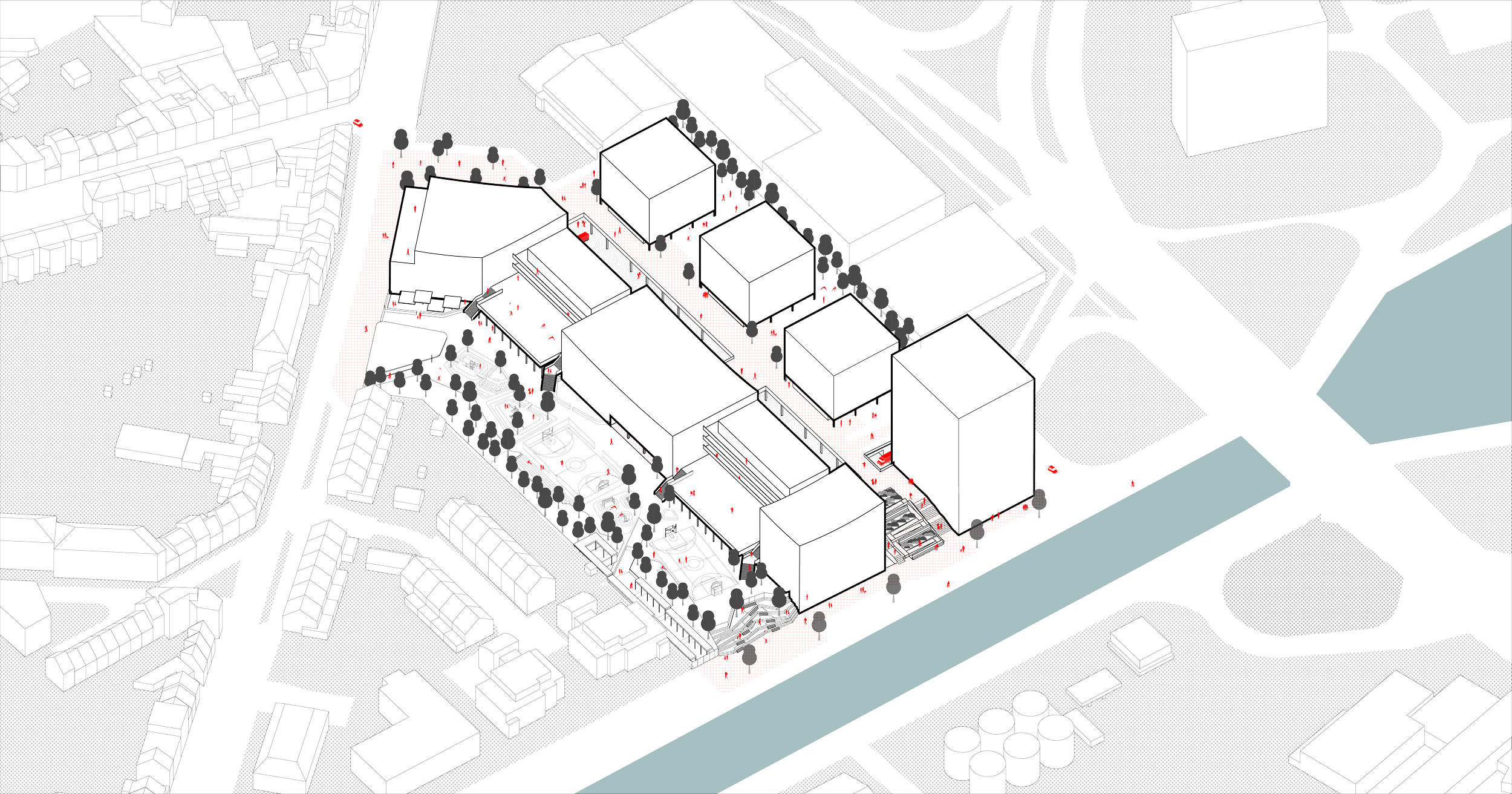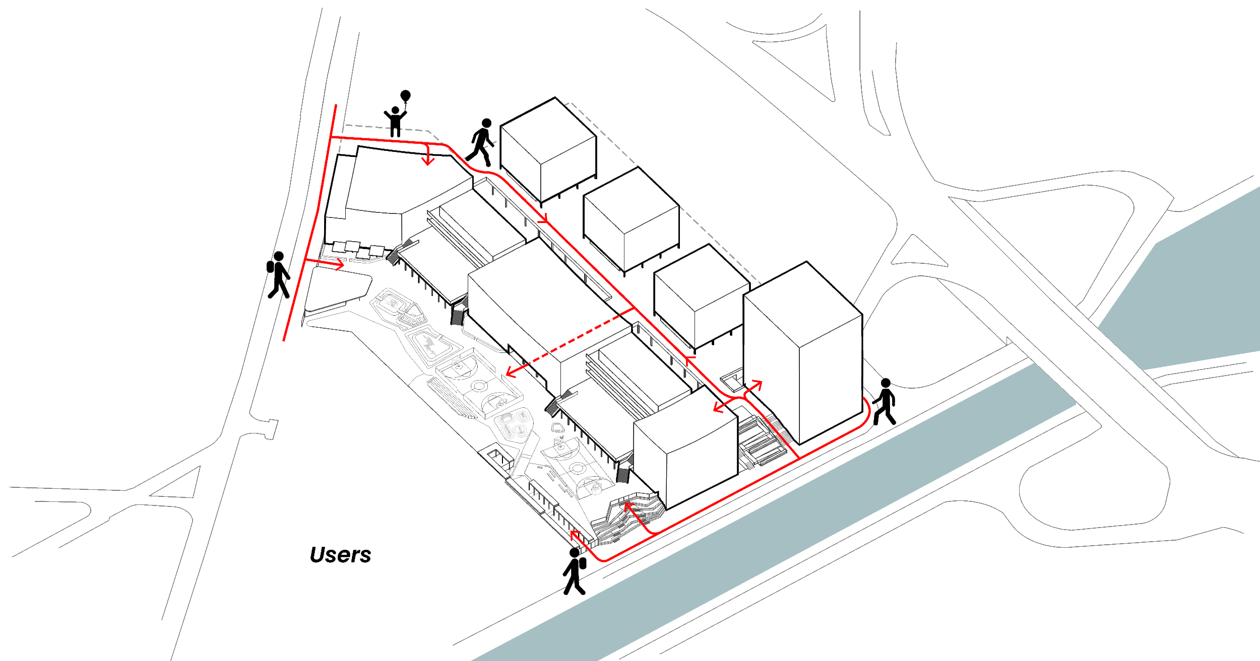 Connecting the three functions are public square and pedestrian/ bicycle path. The circulation system become the link between the pre-existing city, the new buildings and the canal - facilitating the activation of the site activity all day long.