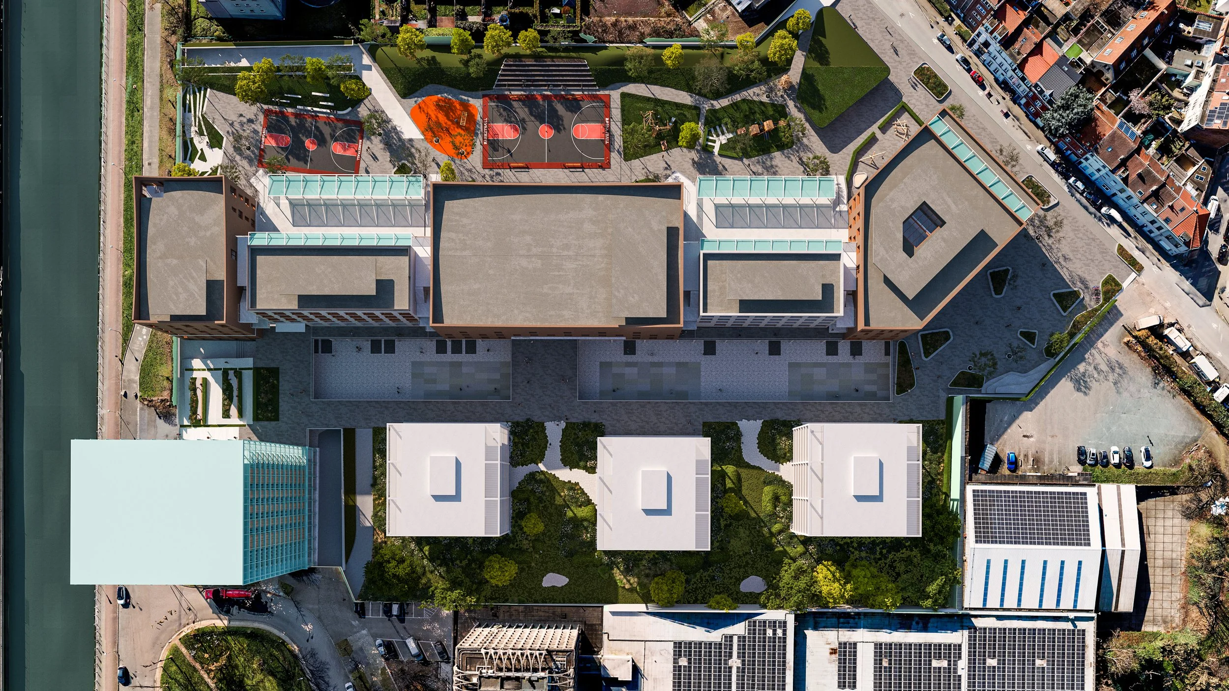 By mixing the productive activities, the school and the residential program, a cross-fertilisation of functions occurs; the public axis through the project is activated and animated by schoolchildren, residents and people who will work in the productive units. The broad use of the school allows locals, sports clubs and organisations to share the sports facilities with the school. Smaller businesses benefit from the new passageway to the canal.