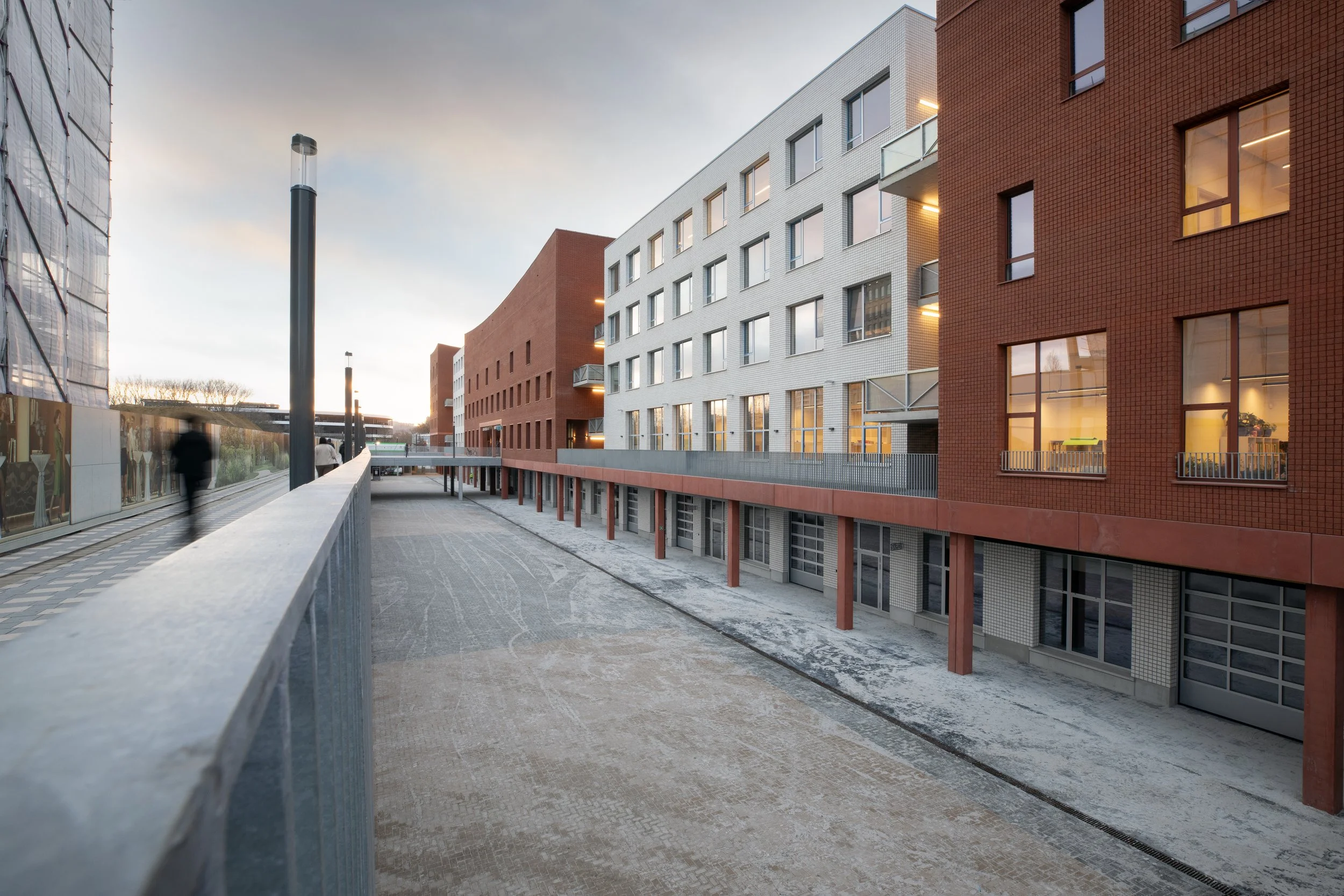 The sports hall is located in the center of the project, in building C, accessible to all schools and situated above the CVO (adult education center). The building is directly connected to the primary and secondary schools but is designed to function independently outside of school hours. The public can access the building through the bridge connecting the promenade to the school.