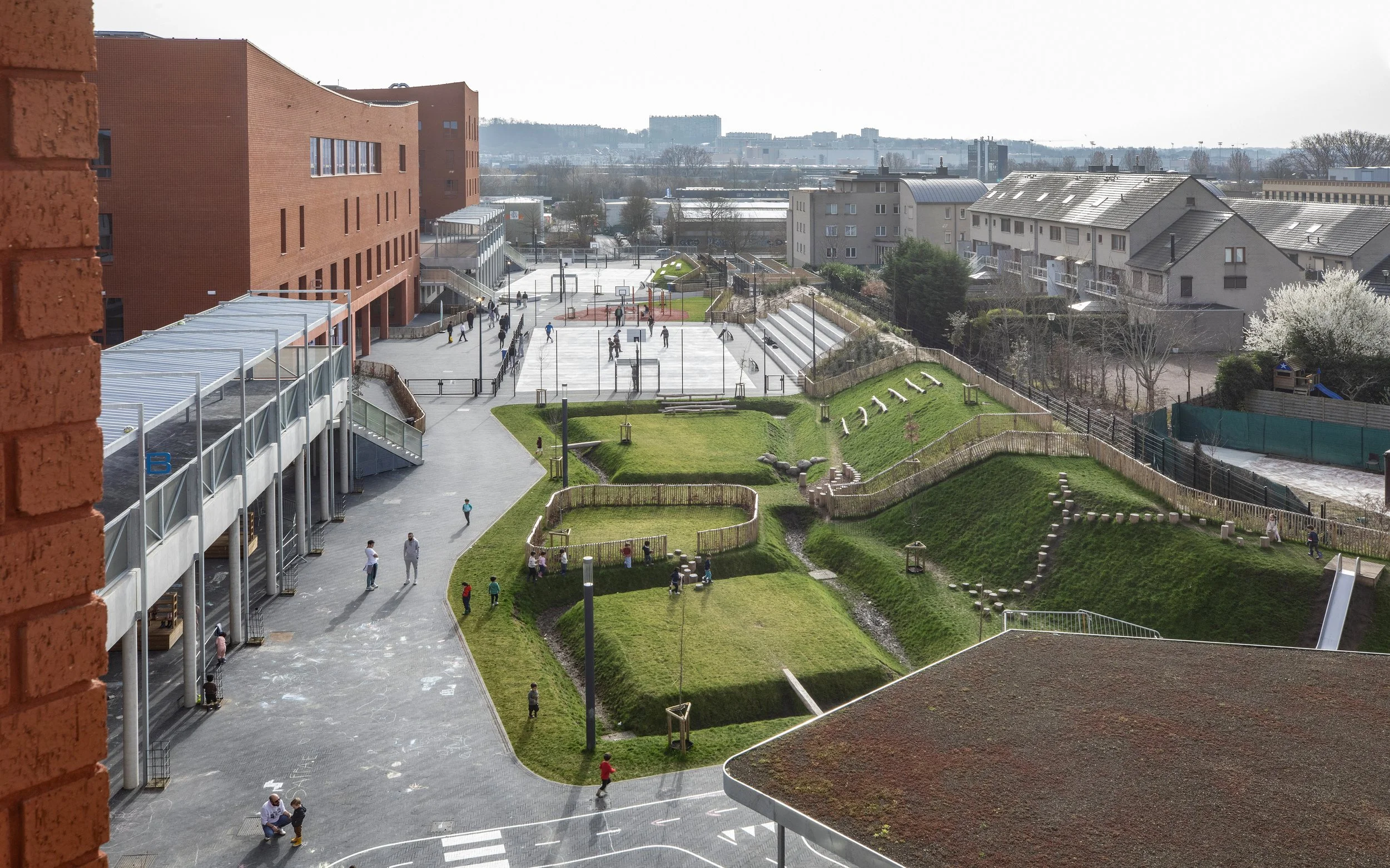 The primary school accommodates 496 children and is located in buildings A and B at levels +01, +02, and +03. The formal entrance is through the square, shared with the daycare center. The school gate leading to the playground and bicycle parking is located on Walcourtstraat.