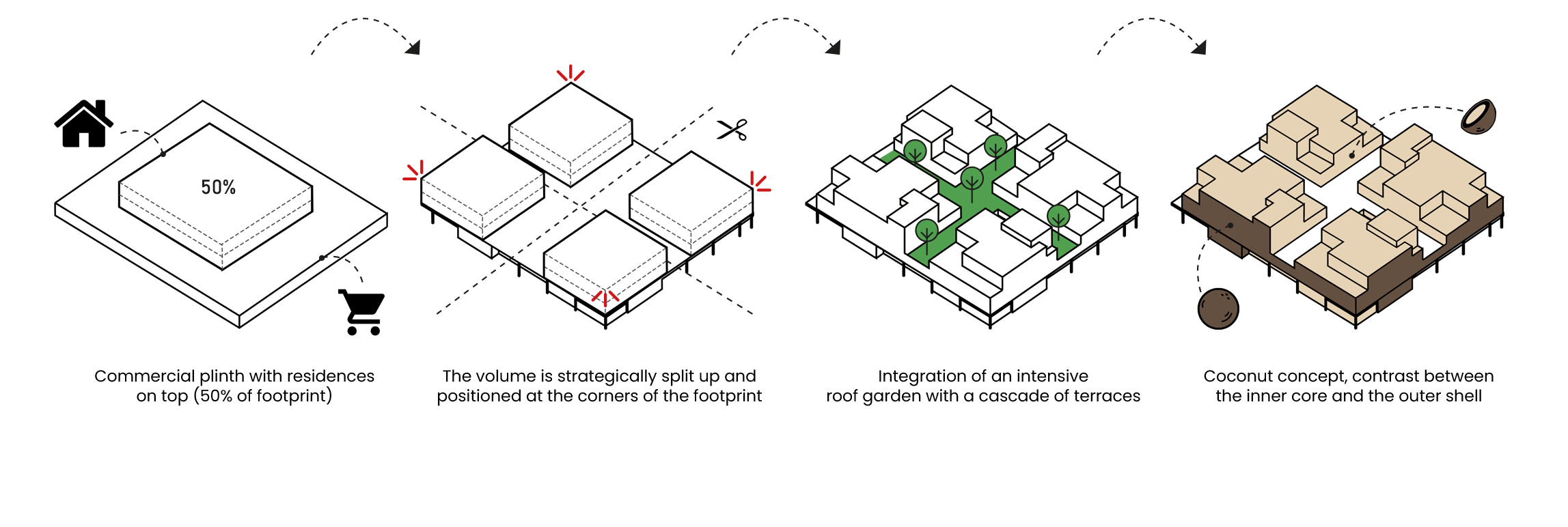 The interior, the flesh of the coconut is characterized by a cascade of generous terraces organised around an intimate communal roof garden. In a coherent way these inward-facing façades are finished in light timber, creating a clear contrast to the darker exterior. This inner-flesh constitutes the core of the project, where the roof garden is conceived as an extension of the green oasis in which it sits