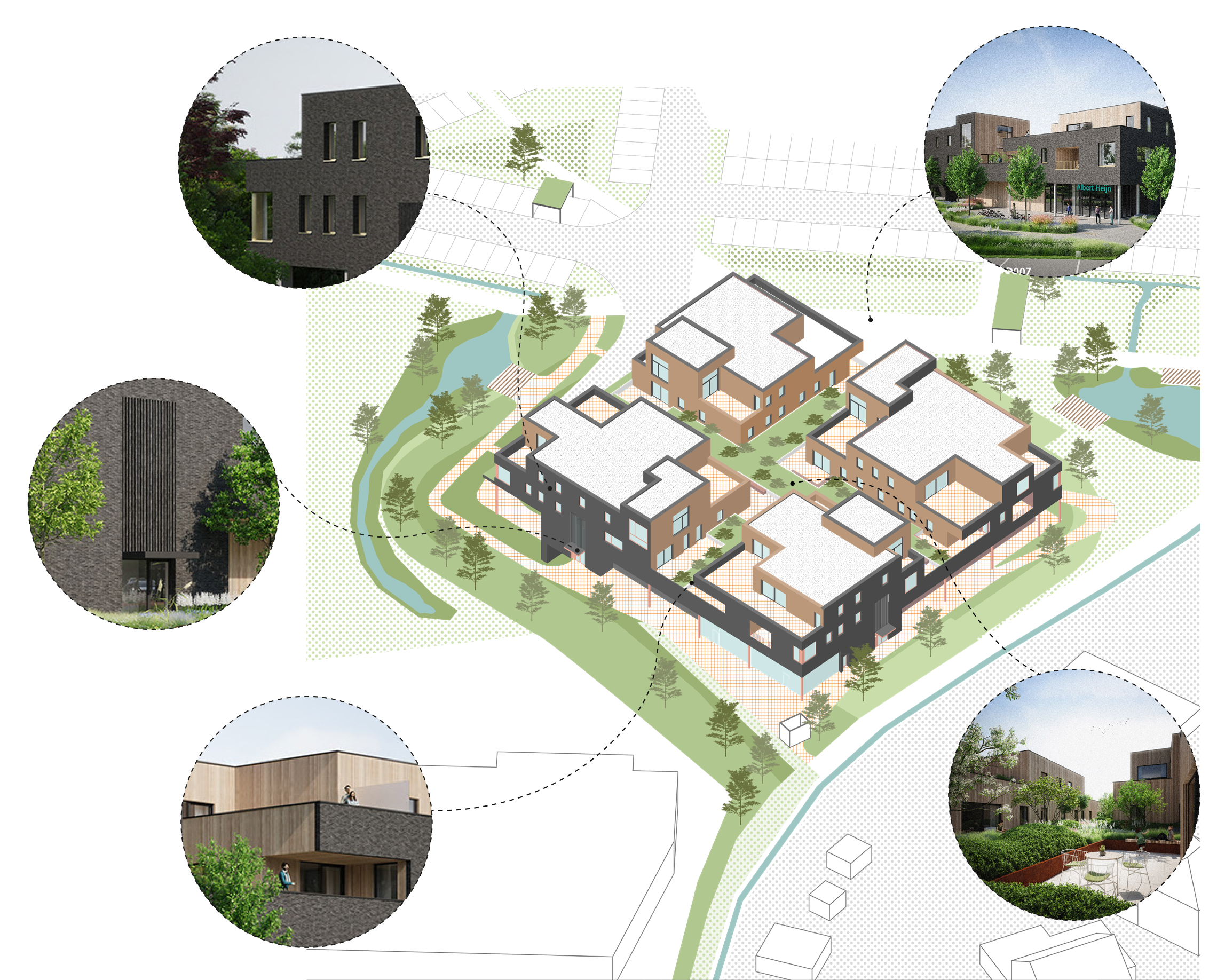 Throughout the design process, the connection with the existing landscape remained a central guiding principle. The building is conceived as a sculptural volume positioned within a green oasis shaped by a fine-grained network of walking routes, creeks, swales and ponds. A landscape framework intentionally designed to serve both residents and the wider neighborhood.