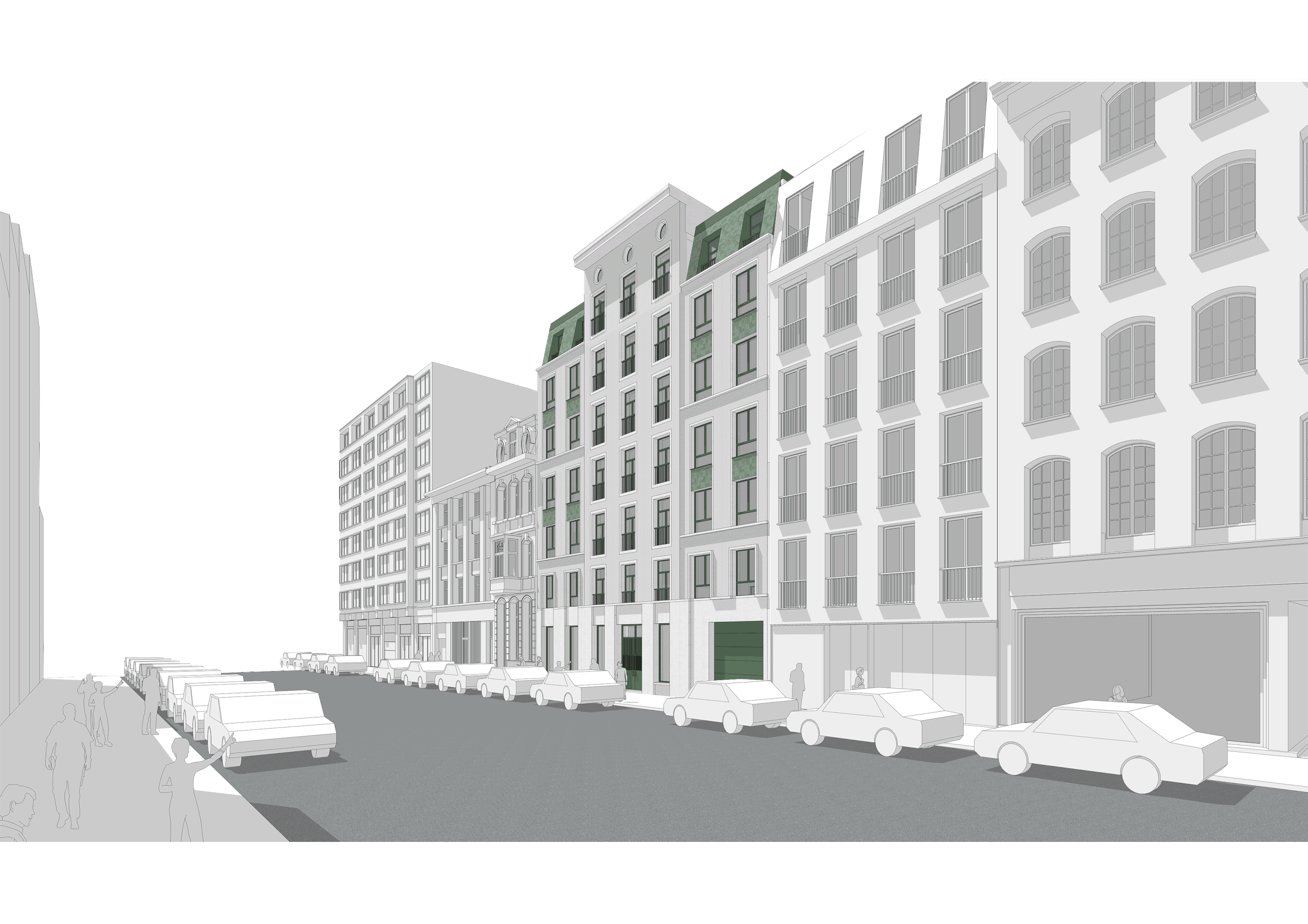 The facade, built up according to a fixed module, allows a future reinterpretation of the program without being tailored to any single function. Its articulation anticipates the scale of the immediate surroundings: residential buildings with a mineral plinth, classical window divisions with distinctive framing and decorative cornices. Continuous pilasters reinforce the verticality of the volume. The window elements, with a characteristic light green colour and their rounded concrete frame form a recurring facade accent.